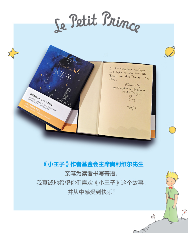 安托万·德·圣埃克苏佩里(Antoine de Saint-Exupéry,1900-1944),法国文学史上最神秘的飞行员作家。与伏尔泰、卢梭、雨果同入先贤祠。毕生崇尚自由,致力于从航空探索人生与文明。小行星以他命名,五十元法郎印刻他的肖像。于1944年一次航拍侦查任务中失踪,传奇生涯,伴随小王子共同消失天际。经典作品: 1931年《夜航》、1939年《人的大地》、1943年《小王子》。