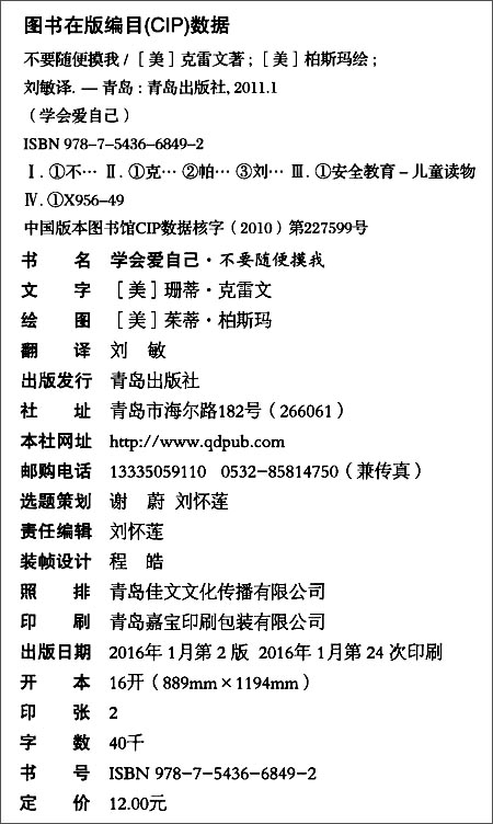 本书曾获本杰明?富兰克林亲子教养类奖,是美国很多家庭和学校对孩子进行性保护教育的教材。书中通过一个儿童性侵犯的案例,教给孩子自己身体的哪些隐秘部位是任何人都不能随意触摸的,以及遇到性侵犯这样的事情时该如何处理。