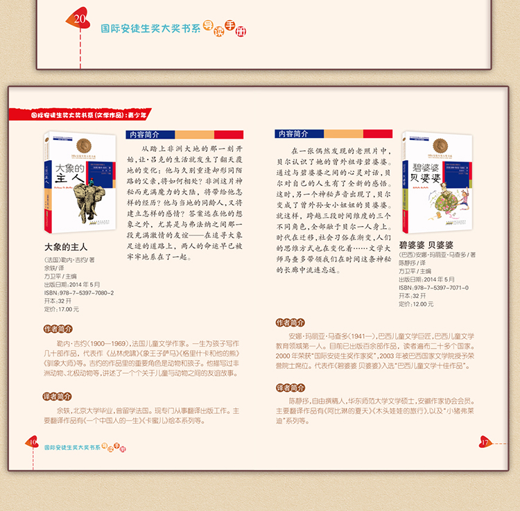 入选的文学作品都是经IBBY各国分会和业内专家层层筛选产生的经典佳作。依列娜.法吉恩、勒内.吉约、贾尼.罗大里、克里斯蒂娜.涅斯特林格这些如雷贯耳的儿童文学大师的名字,如一颗颗璀璨的宝石装点着整个书系。这些至美的经典文学作品给予孩子们最开阔的思想、最宽广的想象、最丰富的文化体验以及最深厚的语言和情感的力量,是呈现给中国少年儿童在这个时代我们能给予他们的最好的精神食粮。