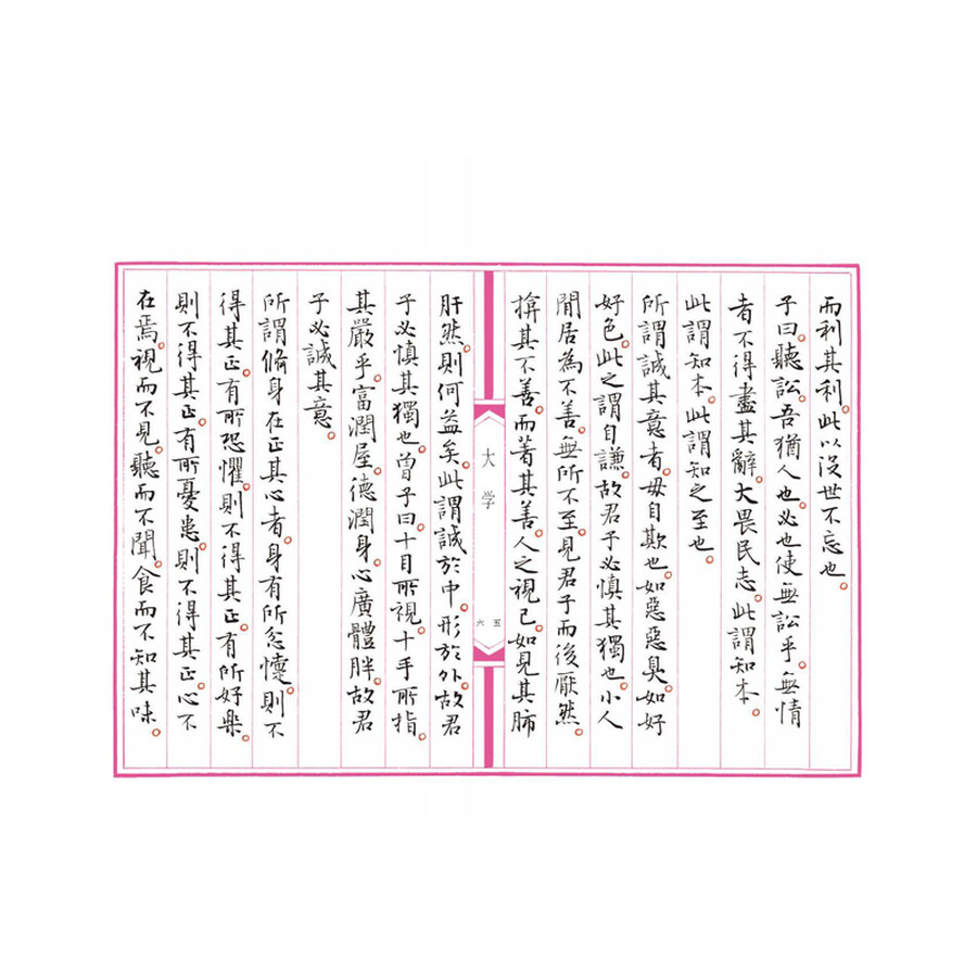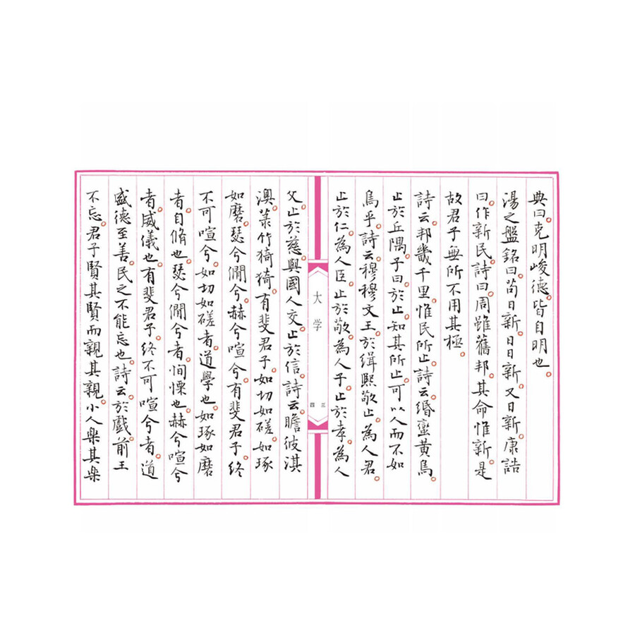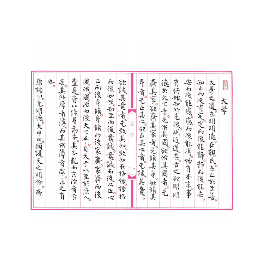 《大学》是儒家的基本经典之一,与《中庸》《论语》《孟子》一起并称为“四书”。古代人至八岁开始启蒙教育,至十五岁开始成人,就要教以穷理、正心、修 己、治人之道,亦即“大人之学”。这些学问概括起来即为“三纲八目”,能使人铸就光明正大的品德,弃旧图新,达到最完善的境界。