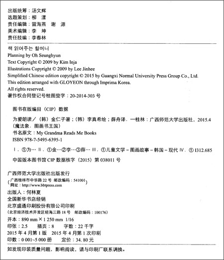 金仁子(Kim Inja):韩国作家。大学主修文学,因为喜欢给孩子读图画书而获得“读书妈妈金仁子”的美誉。看到女儿敏贞每天夜里都打电话为不识字的外婆读书,金仁子有感而发写下了《为爱朗读》的故事。