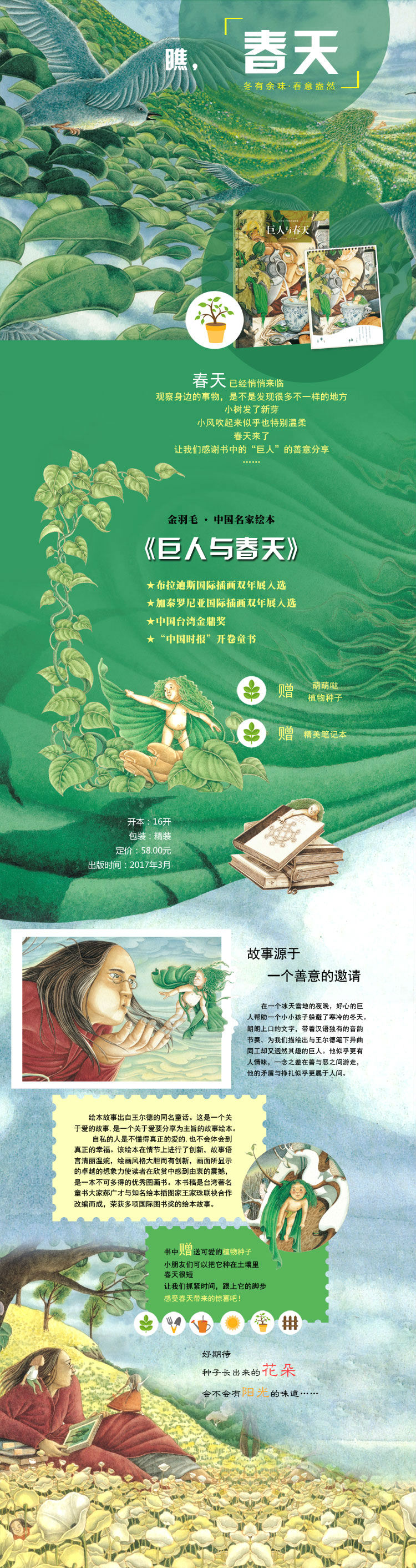 该绘本故事出自王尔德的同名童话。这是一个关于爱的故事,是一个关于爱要分享为主旨的故事绘本——自私的人是不懂得真正的爱的,也不会体会到真正的幸福。该绘本在情节上进行了创新,故事语言清丽温婉,绘画风格大胆而有创新,画面所显示的卓越的想象力使读者在欣赏中感到由衷的震撼,是一本不可多得的优秀图画书。