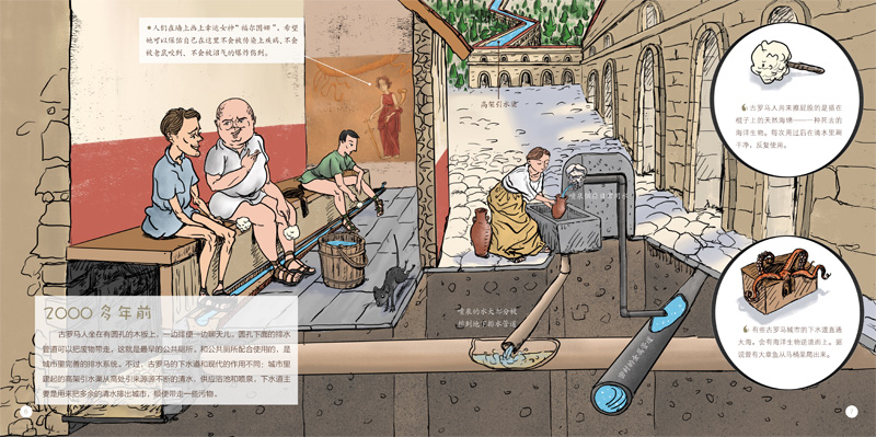 古罗马的城市生活很热闹,看起来有点儿像现代大都市。但是也有很多现在看来不可思议的地方,比如家里的厕所。许多家庭的马桶就安在厨房灶台旁边,并且大多不和下水管道连通,便便通过木板上的孔直接排到下面的罐子里。收集到的粪便可以卖给园丁,用作植物的肥料。尿液分解产生的氨气可以起到清洁作用,因此还有羊毛商人挨家挨户收集尿液,用来给羊毛提亮增白。