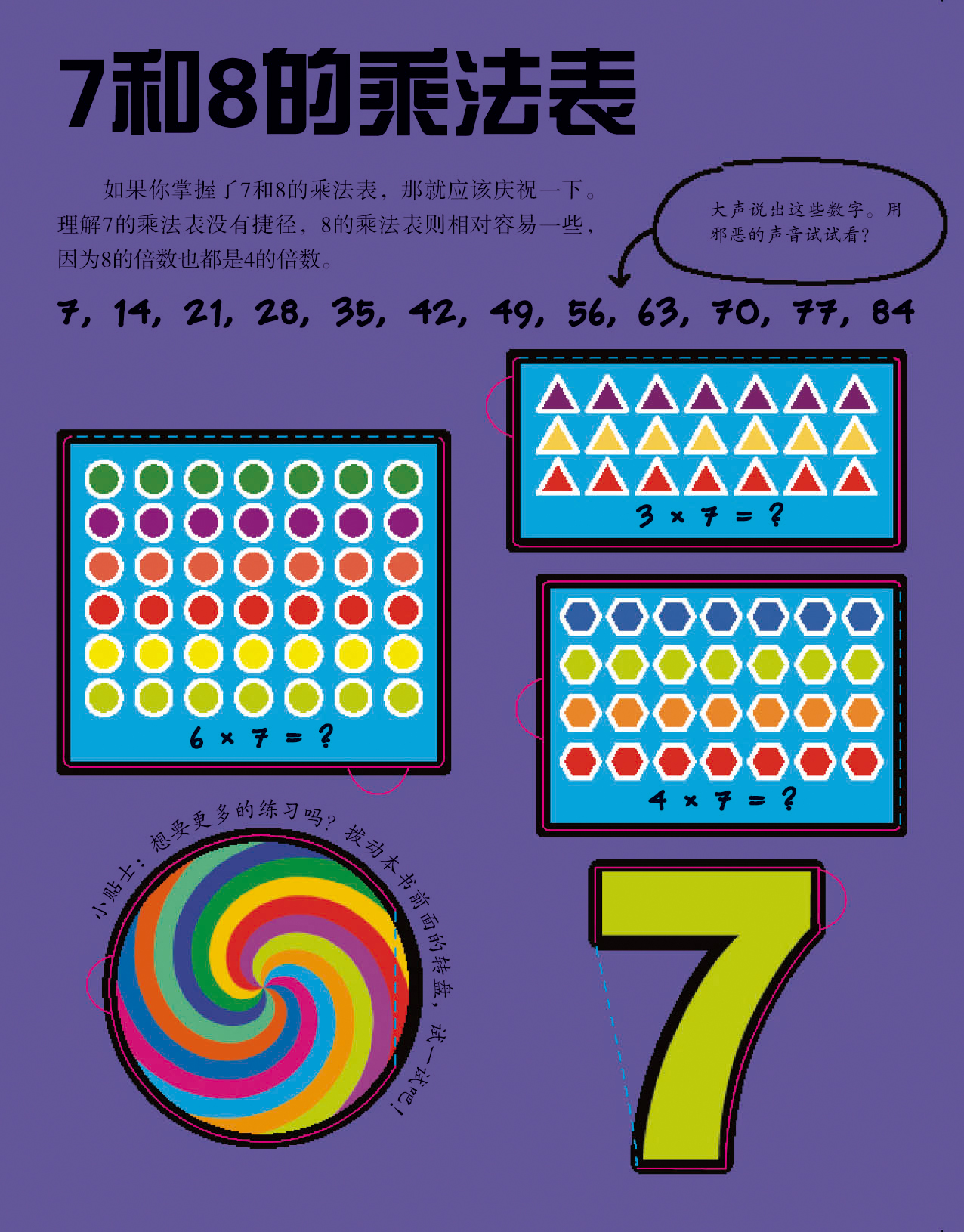 当你学习乘法的时候,熟能生巧的道理一点没错。然而,要让乘法的学习新鲜又有趣却大有讲究。转动封面上的旋涡转盘,乘法运算就一一出现了。大量的翻页、丰富的色彩和饶有趣味的问答让孩子们对乘法运算爱不释手,收获满满。巩固乘法表的方法也多种多样,有数字方格、乘法转盘、小提示和记忆线索等等,你甚至还要大声喊出来哦。