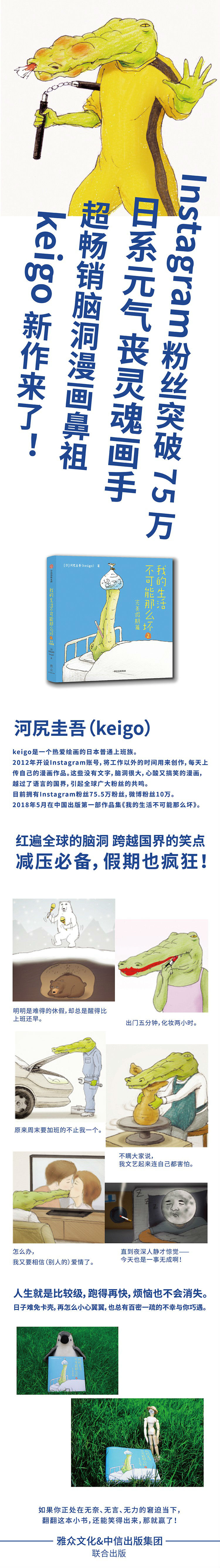 Keigo是以Ins为创作分享平台的插画创作者,平时是一个普通上班族。2012年开设了Ins账号,将工作以外的时间用来创作。这些没有文字,脑洞很大,心酸又搞笑的插画,越过了语言的国界,引起了全球广大粉丝的共鸣。目前拥有Ins粉丝75万。2018年5月在日本和中国出版首部漫画集《我的生活不可能那么坏》。