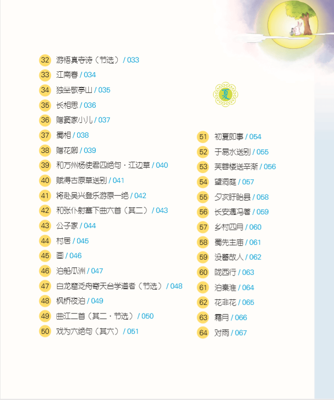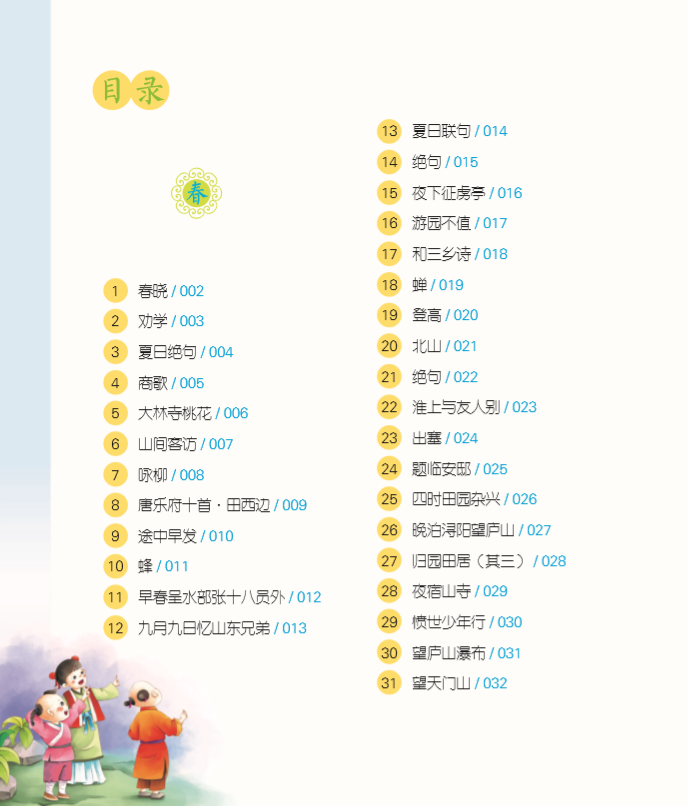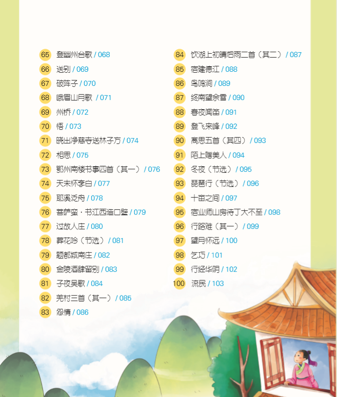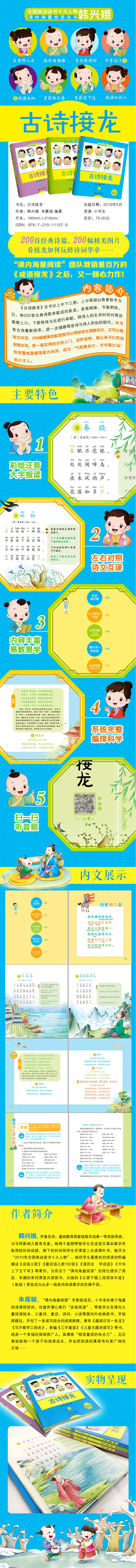 《古诗接龙》全书分上中下三册,上中两册以春夏秋冬为引,将两百首古典诗歌串联成四条龙。首尾相接,节奏明快,朗朗上口。诗歌全文注音、标注作者生卒时间,以左右对照的形式进行翻译,方便学生在课堂共读或自学时,遮挡古诗说诗意,遮挡诗意背古诗。下册将诗与史进行串联,运用历史朝代歌对历史进行纲目性的介绍,还按诗人的生卒时间对两百首古诗重新排序,进一步理顺每首诗与诗人所处的朝代。本书图文并茂,两百幅精美的配图既可以帮助学生理解诗文,又可以看图猜古诗,是一套实用的古诗入门、进阶读物。