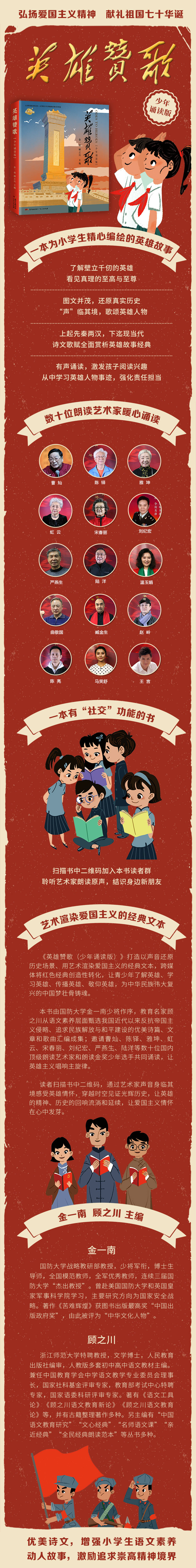本书由国防大学金一南少将作序,教育名家顾之川从语文素养层面甄选我国近代以来反抗帝国主义侵略、追求民族解放与和平建设的优美诗篇、文章和歌曲汇编成集;邀请虹云、雅坤、曹灿、陈铎、宋春丽等数十位国内顶级朗读艺术家和朗读金奖少年选手共同诵读,让英雄主义唱响主旋律。