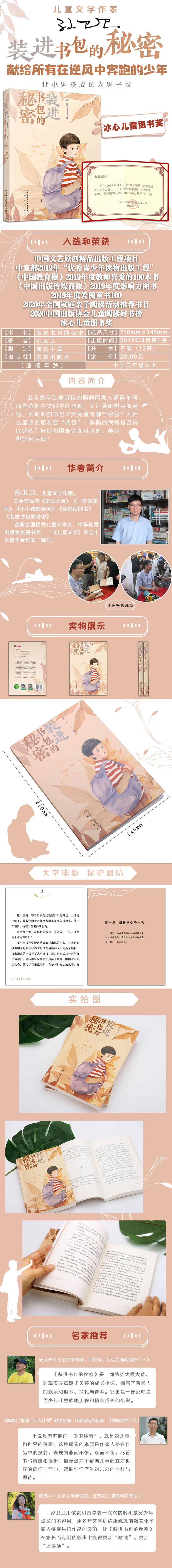 执着、单纯、善良的五年级学生姜听棋正想告诉妈妈作文比赛入围的喜讯,却传来妈妈因救人遭遇车祸的消息。爸爸巧遇初中女同学郑红,她是助人为乐,还是另有所图?姜听棋如何与她及她女儿相处?沉甸甸的书包里究竟藏有哪些秘密,为什么*好的朋友要“调包”?妈妈的病情是否得以好转?生活不都是风和日丽,当遇到困难与挫折的时候,是怨天尤人,还是知难而进?主人公姜听棋用自己的努力给出了*好的回答,他也完成了从小男孩儿到小男子汉的蜕变。