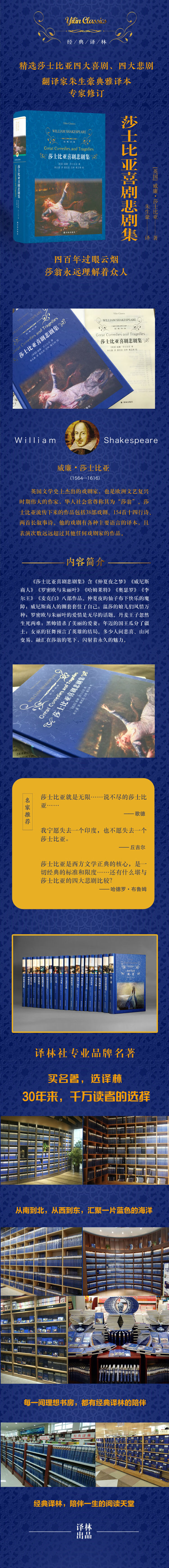 《莎士比亚喜剧悲剧集》是莎士比亚优秀喜剧和悲剧作品的精选集,主要包括《仲夏夜之梦》、《威尼斯商人》、《罗密欧与朱丽叶》、《哈姆莱特》、《奥瑟罗》、《李尔王》、《麦克白》八部作品。莎士比亚每部作品都是人生某种境况的缩影,是人性善恶的某种展示, 是人类某种激情的宣泄,也都包含着关于社会人生的某种哲理。