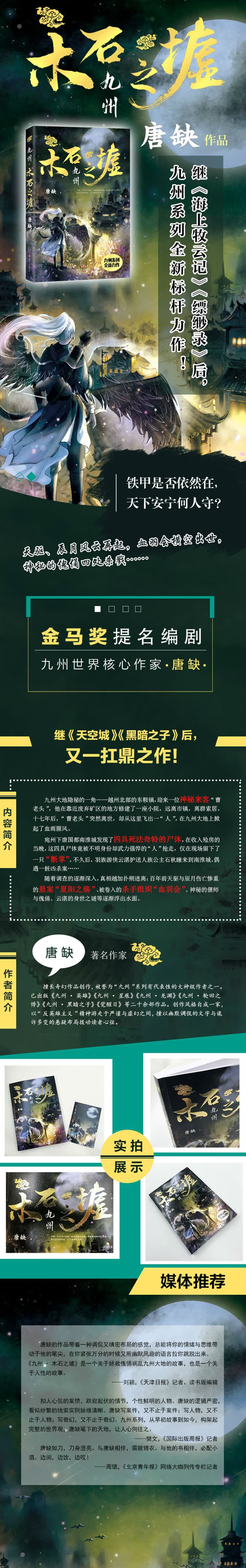 唐缺,著名作家,擅长奇幻作品创作,被誉为“九州”系列zui有代表性的大神级作者之一。已出版《九州·英雄》《九州·星痕》《九州·龙渊》《九州·轮回之悸》《九州·黑暗之子》《觉醒日》等二十余部作品。创作风格自成一家,以“反英雄主义”精神游走于严谨与虚幻之间,擅以幽默调侃的文字与诡诈多变的悬疑布局拨动读者心弦。