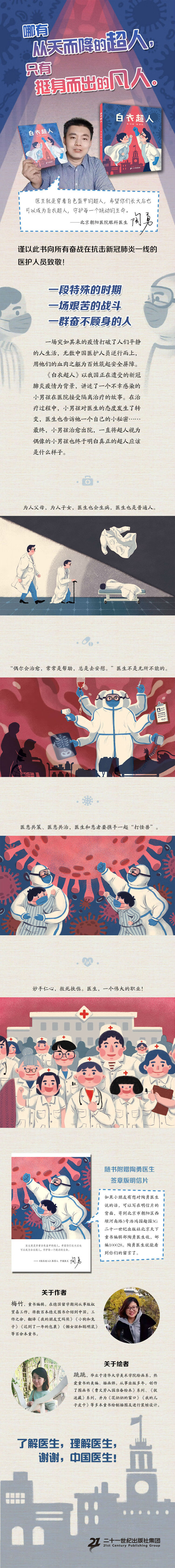 《白衣超人》以此次新冠肺炎爆发为背景,讲述一个小男孩不幸感染,他以为会有超人从天而降来解救他,然而,来的却是他平时最不喜欢见到的医生。妈妈告诉他,在医院要听医生的话,因为医生才是真正的超人。在隔离治疗的日子里,小男孩对医生的态度发生了转变,医生也告诉他一个自己的秘密……最终,小男孩治愈出院,也明白了真正的超人应该是什么样子。作品从儿童的视角和阅读心理出发,以绘本故事的形式,引导孩子了解医生、理解医生,了解生命的意义。