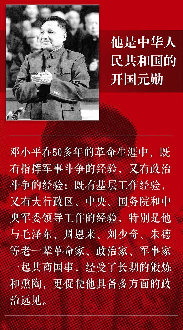 邓小平是中国共产党最早的党员和积极活动家之一,他在长达 50 多年的革命生涯中,积累的经验最丰富、最全面,他既有指挥军事斗争的经验,又有政治斗争的经验;既有基层工作经验,又有大行政区、中央、国务院和中央军委领导工作的经验,特别是他与毛泽东、周恩来、刘少奇、朱德等老一辈革命家、政治家、军事家一起共商国是,经受了长期的锻炼和熏陶,更促使他具备多方面的政治远见,多谋善断,意志坚强,行动果断,气度宽广等领袖人物的品格。1951 年 9 月 3 日,毛泽东在与梁漱溟谈话时,脱口称赞邓小平:“无论是政治,还是军事,论文论武,邓小平都是一把好手。” 毛泽东在 1975 年 4 月向金日成介绍邓小平时,特别提到:邓小平会打仗。