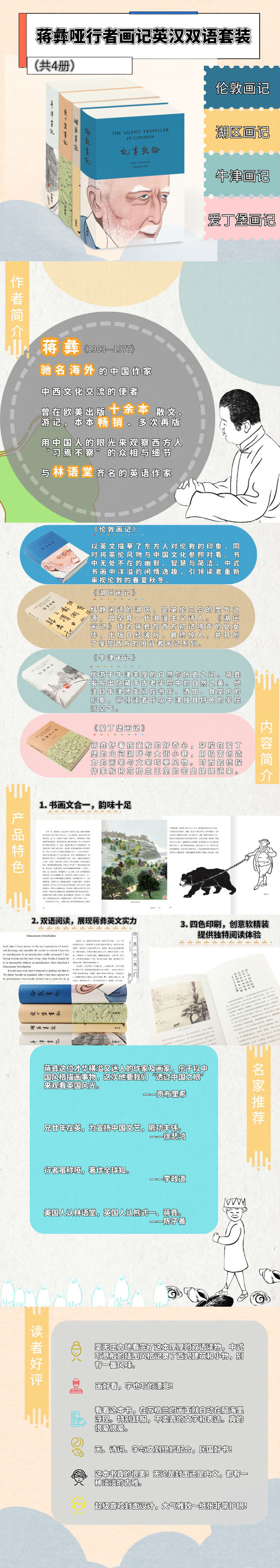 《蒋彝哑行者画记英汉双语套装(共4册)》由《伦敦画记》《湖区画记》《爱丁堡画记》《牛津画记》四部著作组成的套装。书中以英文描摹了一个东方人对英国的印象,作者将英伦风物与中国文化参照对看。写作风格幽默、简洁、中西合璧,在中式书画中洋溢闲情逸趣,细致而精到地勾勒出英国生活的画面与众生样貌。