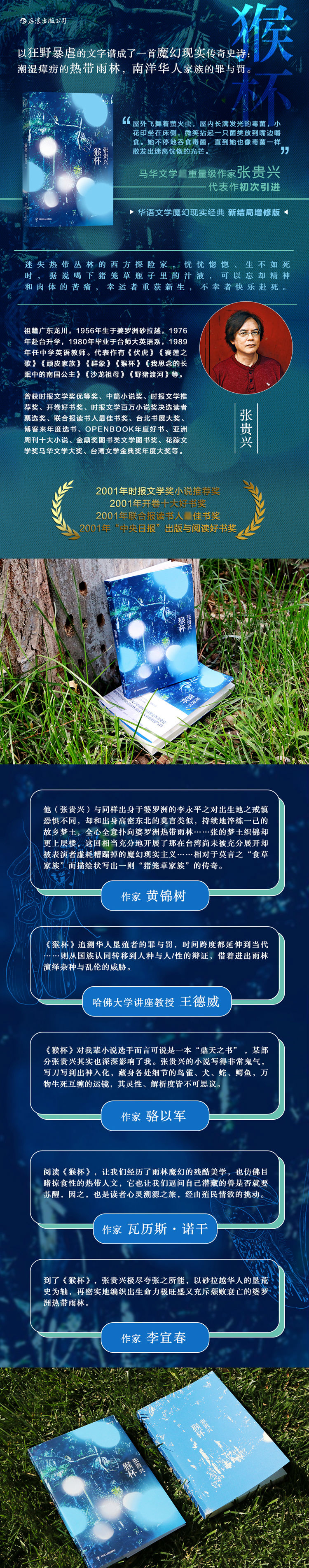 张贵兴,祖籍广东龙川,1956 年生于婆罗洲砂拉越,1976 年赴台升学,1980 年毕业于台师大英语系,1989 年任中学英语教师。代表作有《伏虎》《赛莲之歌》《顽皮家族》《群象》《猴杯》《我思念的长眠中的南国公主》《沙龙祖母》《野猪渡河》等。