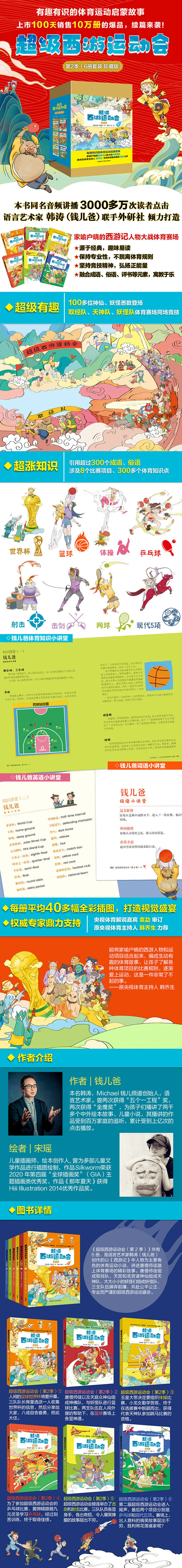 《超级西游运动会(第2季)》共6册,是语言艺术家韩涛(钱儿爸)创作的以《西游记》中人物为主要角色的体育运动小说,讲述唐僧师徒踏上体育赛场的精彩故事。唐僧师徒组成取经队,天宫和龙宫诸神仙组成天神队,大大小小的妖怪们组成妖怪队,三支队伍摒弃前嫌,共赴公平公正、专业而严谨的超级西游运动盛会。