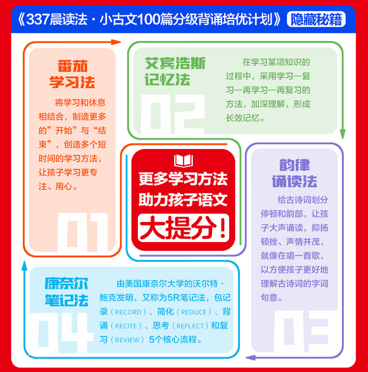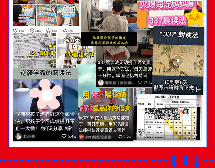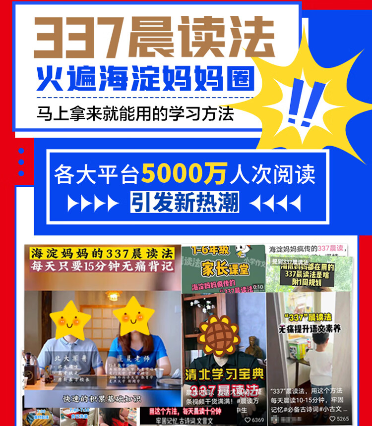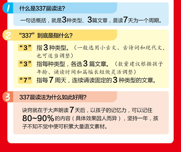 337晨读法诀窍就在于大声朗读7天后,以孩子的记忆力,可以记住80~90%的内容(具体效果因人而异), 坚持-年,孩子不知不觉中便可积累大量语文素材。