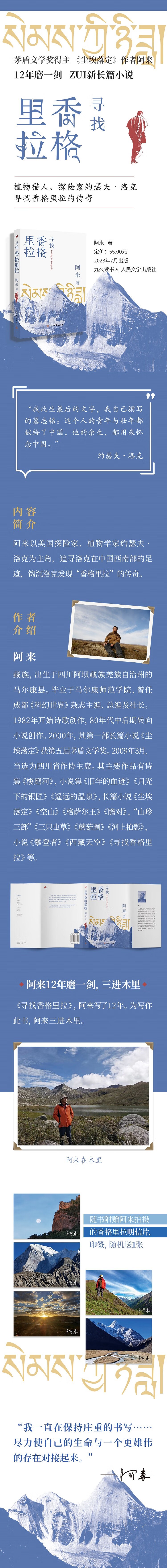 《寻找香格里拉》是茅盾文学奖得主、《尘埃落地》作者阿来新创作的一部长篇小说,讲述世世界著名探险家、植物猎人约瑟夫?洛克寻找、发现香格里拉的传奇。上世纪二十年代,约瑟夫?洛克以植物学家、撰稿人的身份辗转来到中国云南,在当地人的帮助下,沿途不断发现中国西南美丽且丰饶的植物、山川湖泊之美,蓝天白云下淳朴的生命,并把香格里拉之美传递给了全世界。