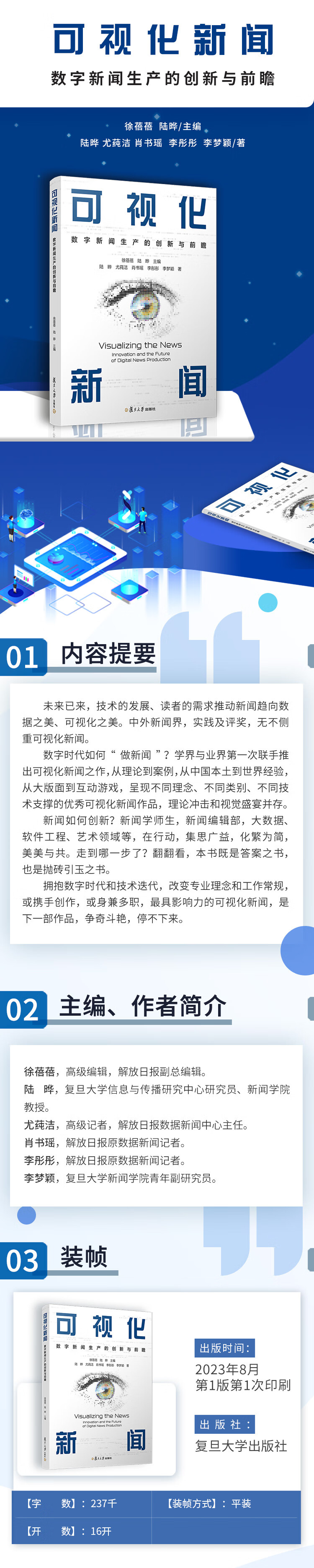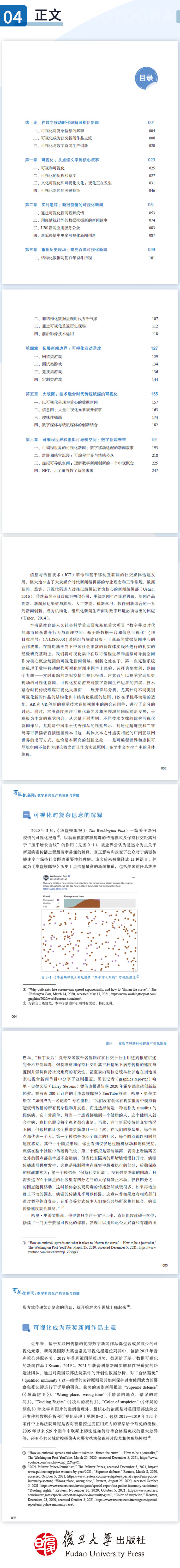 数字新闻创新性的重要变化之一,在于可视化从过往新闻文本的文字内容点缀逐渐演变为数字新闻产品的核心叙事。在系统梳理这一变化的技术文化背景基础上,本书重点分析了可视化作为数字新闻核心叙事的中国经验,通过丰富的国内外前沿案例梳理和分析不同主题、不同类别数字新闻可视化实践的创新思路、技术策略、呈现形态,并进一步讨论这些前沿案例如何通过滑屏和感官沉浸凸显出可视化新闻叙事的情感体验,并对可视化新闻叙事生成的“虚拟可导航空间”的特征和理论价值进行了前瞻性分析。