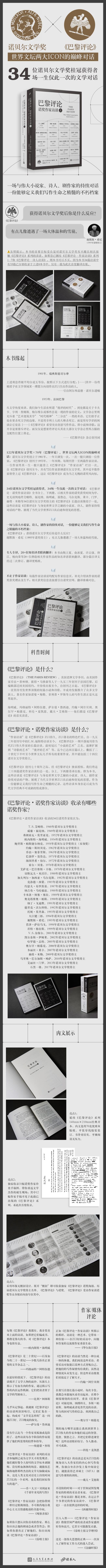 ★34位诺贝尔文学奖桂冠获得者,34场一生 的文学对话:全书分上下两册,以诺奖获奖时间为序, 地将艾略特、福克纳、海明威、聂鲁达、马尔克斯、莱辛、门罗、赫塔?米勒等34位诺贝尔文学奖得主的《巴黎评论》长篇访谈集结一处,集中出版。这些访谈是《巴黎评论》与身处世界文学之巅的小说家、诗人、剧作家持续对话的产物,展现了当代文学世界 启迪和创见的思想;