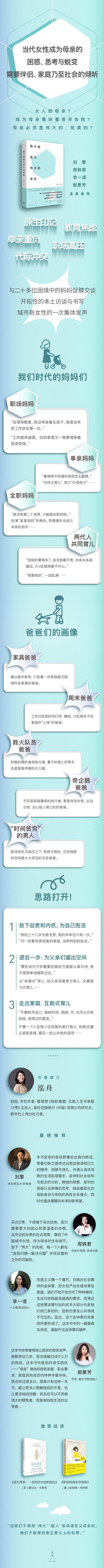 城市女性身为母亲所面临的普遍困境,落在每一个个体身上,都是复杂而幽微的,像大海一样,看起来是一望无际的蔚蓝,但若仔细聆听,每一片海浪打落在礁石上所激起的潮水声都是不同的。 本书记录了职场妈妈、单亲妈妈、全职妈妈、两代人共同育儿等育儿条件下的女性,希望通过不同的育儿选择来探讨其背后的本质是什么,以及当抛开母亲的身份,她们渴望成为的那个自己究竟是谁;并试着寻找解决女性如此疲惫与困扰的线索?在我们的价值体系里、职业生涯设计里和公共育儿制度里……
