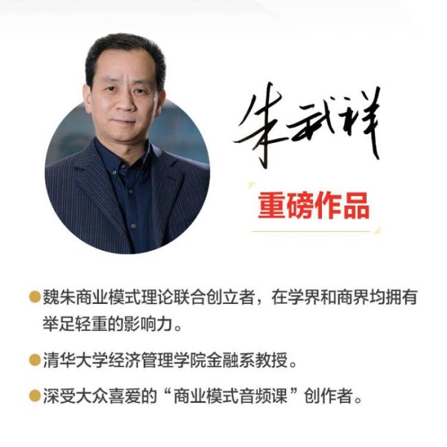 朱武祥 1.专注商业模式研究领域,在学界和商界均拥有举足轻重的影响力。 朱武祥教授提出的魏朱商业模式理论已成为商业模式领域的基础性理论,支撑着整个领域的研究和实践活动。其合著的《发现商业模式》《重构商业模式》等一系列书籍广泛流传,使商业模式成为整个商业界的持久焦点。 2.中国理论和方法的总结者、传播者。 在移动物联网、大数据、AI等技术 的新商业世界,小米、瑞幸等企业在商业模式创新方面已成为世界焦点。朱武祥教授聚焦本土经验,致力于思考和解决商业模式的底层问题,为企业和个体提新环境下的商业模式设计指南。 3.深受大众喜爱的“热门音频书”创造者。 凭借着扎实的功底和出色的表达能力,朱武祥教授总能用轻松幽默的方式把复杂问题讲得明明白白,这也使他开设的商业模式课程深受清华EMBA和MBA学生的欢迎,他的音频课程成了互联网中的爆品。