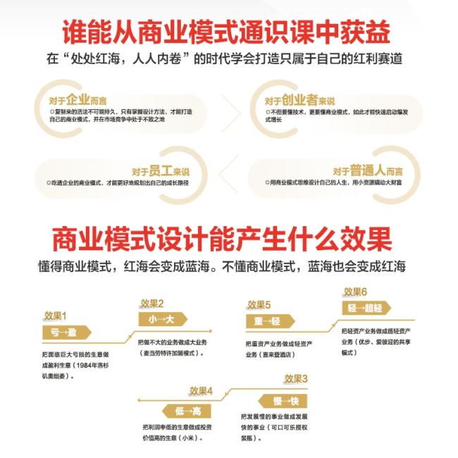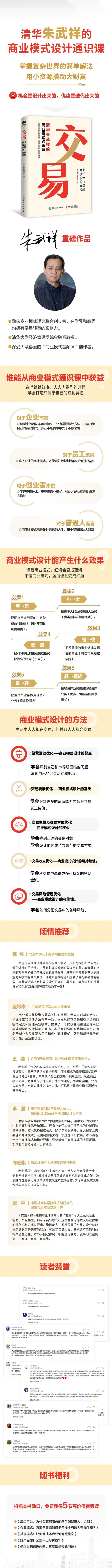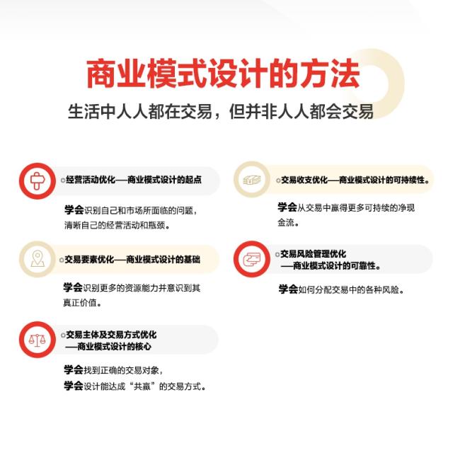 ◆机会是设计出来的,优势是迭代出来的。掌握商业模式思维,创造只属于自己的红利赛道! 一本透析市场底层逻辑的生存指南。 在处处红海、人人内卷的时代,市场新机会刚露头,各种力量就会蜂拥而至。新赛道竞争意味着巨大的资源需求和风险,而这 不是普通企业和普通个体所能承担的。这种形势下,要想成功逆袭,就须基于商业模式设计的底层逻辑,打造只属于自己的赛道。那些看似没有机会的地方,实则充满着巨大的能量,懂得商业模式,你就能快速找到自己的发展通道和优势。 对于企业而言,复制来的活法不可能持久,只有量身 的商业模式,才能使自己在市场竞争中拥有牢靠的阵地;对于员工来说,吃透企业的商业模式,才能 好地规划出自己的成长路径;对于创业者来说,只有把握影响商业世界的核心力量和动能,才能启动爆发式增长的进程;对于普通人而言,想用仅有的那点筹码获得逆袭,就须充分懂得交易的原则和方法…… ◆越懂借力,就越不费力。围绕交易打造杠杆,让小投入撬动大财富。一本复杂世界的解法手册。 生活中人人都在交易,但并非人人都会交易。看似简单的交易,实则蕴含着无限的可能性,每种可能性意味着一种商业模式,而各种可能性所带来的结果也有着天壤之别。盘点自己优势,尽可能辨别自己欠缺或对自己有价值的资源,明确交易对手和交易方式,规划交易收支,控制交易风险……在有关交易的每个模块,都存在大量可设计的空间。掌握必要的原则和技巧,我们就能在这些空间中大展身手,将商业模式打造成撬动各种外界资源的杠杆。 ◆ 一本包含100多个各类案例的落地案例库。大量实际场景、大量现实案例,全方面阐述商业模式设计如何在各行各业中运用。 从薛兆丰的知识交易到某税务老师的服务升级,从巴菲特的昂贵午餐到某咖啡店的经营模式,从小米的生态链到瑞幸的病毒式营销……从企业巨头的战略布置到个体经营者的扩展策略,从互联网企业营销推广到传统企业的管理方式,从职业人士的财富积累到普通学生的未来规划……只要把握了商业模式设计的底层逻辑,只要吃透各种场景和商业环境,商业模式设计就能在各行各业、各个业务部门发挥至关重要的作用。 ◆ 一本包含大量图解、语言通俗的易读之书。 本书的语言通俗易懂,大幅降低了阅读门槛,本书使用了大量图解,努力节省读者阅读时间。 ◆ 一本可免费获得多节音频课的稳赚之书。 本书附送5节“商业模式”互联网音频课,如《单边平台:为什么韩都衣舍的杀手锏是三人小组制》《 众筹模式:农家乐餐馆如何把亏损业务转为赚钱生意?》《共享模式:让你低成本专业地仰望星空》《好产品为什么卖不出好价钱?》《你以为的管理问题,其实都是模式问题》等。