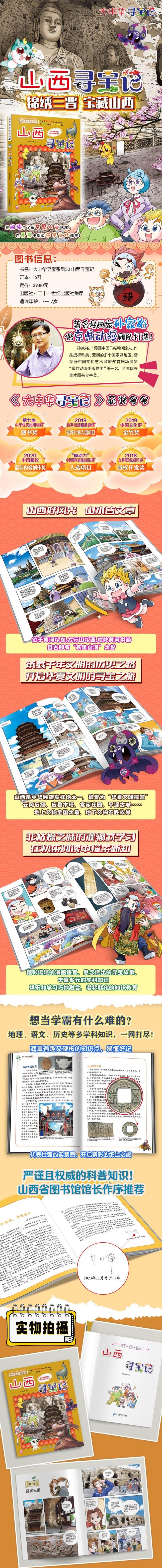 《大中华寻宝系列30山西寻宝记》是一部融合了地理与文史知识,集趣味性、可读性于一体的原创知识漫画作品。它以惊险逗趣的寻宝故事为载体,带领读者了解锦绣山西的历史遗迹、地理人文等知识。“大中华寻宝系列”让孩子们认识、了解、热爱这片生活着的中华大地,激发他们的爱国热情,是中华文化别开生面的呈现。