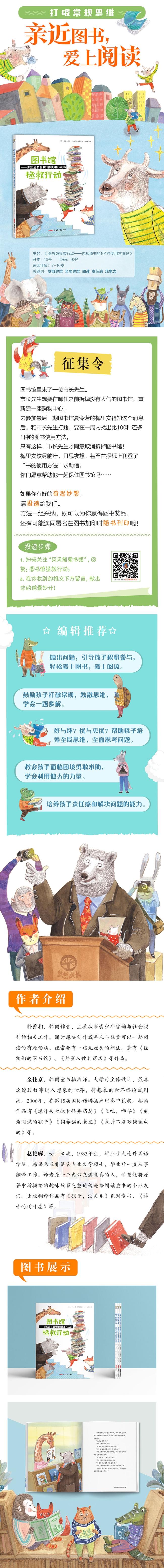 山羊梅里安家乡的图书馆里来了一位市长先生,市长先生想要在卸任之前拆掉没有人气的图书馆,重新建一座购物中心。去参加 一期图书馆夏令营的梅里安得知这个消息后,和市长先生打赌要在一周内找出比100种还多1种的图书使用方法。只有这样,市长先生才同意取消拆掉图书馆!梅里安绞尽脑汁,日思夜想,还在河马奶奶的建议下刊登了“书的使用方法”求助信。大家纷纷为他出主意:学习、当礼物、制作书签、装饰品、扇子……梅里安能成功找出101种图书的使用方法吗?你们愿意帮助他一起保住图书馆吗……