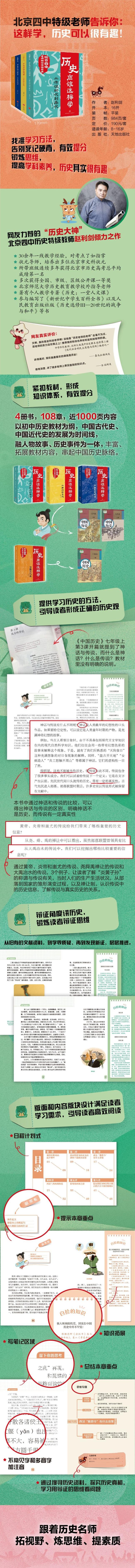 1. 北京四中历史特级教师赵利剑专为8~16岁青少年打造的中国历史读物。赵利剑老师有30多年的一线教学经验,所带班级连续多年获得北京市历史高考总平均成绩 名,他曾培养出多位北京市文科状元。每逢他的公开课,都是人员“爆满”,一座难求。