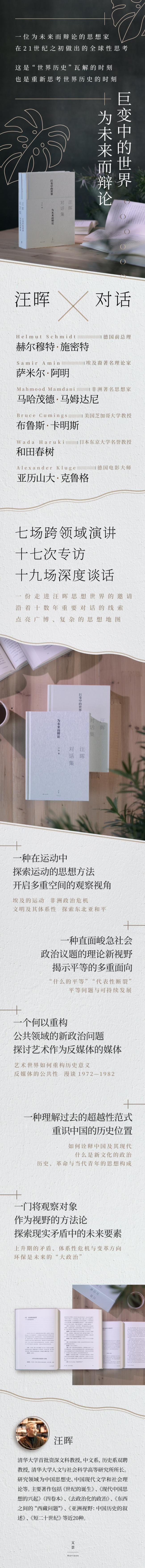 汪晖对话德国前 赫尔穆特· 施密特(Helmut Schmidt)、埃及裔 理论家萨米尔·阿明(Samir Amin)、非洲 思想家马哈茂德· 马姆达尼(Mahmood Mamdani)、美国芝加哥大学教授布鲁斯·卡明斯(Bruce Cumings)、日本东京大学名誉教授和田春树(Wada Haruki)、德国电影大师亚历山大·克鲁格(Alexander Kluge)、纪录片导演王兵…… 七场跨领域演讲、十七次专访、十九场深度谈话,构成了这本对话集。其中涉及汪晖教授对多重空间中的运动、文明及其跨体系性、现代中国的历史位置、新文化的政治、艺术作为反媒体的媒体等当代思想文化关键问题的思考。这本书不仅呈现了各国学者间的思想碰撞, 是一份对政治、历史、文学、艺术等跨领域互动的精彩记录。本书通过对话的形式,重构了21世纪之初的世界与思想图景,同时也提供了一种理解中国和世界的全新角度。