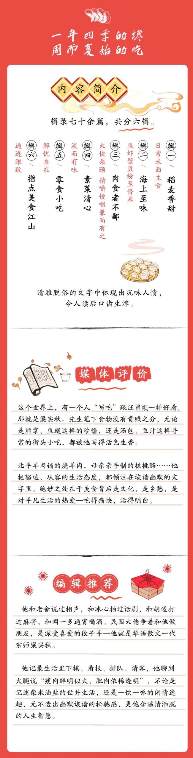 他和老舍说过相声,和冰心拍过话剧,和胡适打过麻将,和闻一多通宵喝酒。民国大佬争着和他做朋友,是深受喜爱的段子手——他就是华语散文一代宗师梁实秋。 他记录生活里下棋、看报、排队、请客,他聊到火腿说“瘦肉鲜明似火,肥肉依稀透明”,不论是记述柴米油盐的世井生活,还是一饮一啄的闲情逸趣,无不透出幽默诙谐的松驰感, 饱含温情洒脱的人生智慧。