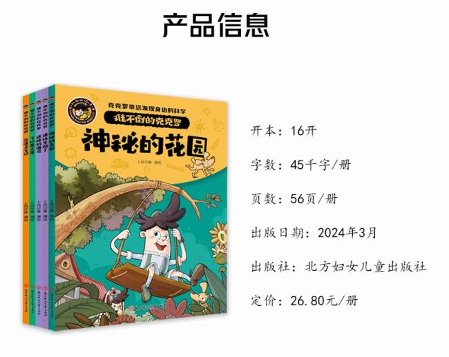 克克罗”丛书以虚构的漫画人物形象克克罗的视角,展现了一个想象力丰富又充满乐趣的漫画世界。克克罗以爱冒险的大侦探的形象出场,他和自己的宠物狗道格身边总是发生着一系列有趣、神奇的“案件”。故事深入浅出地引入了物理、化学、数学、生物等科学常识,用符合孩子阅读习惯的漫画语言风格,柔和的色彩,灵动鲜活的形象,以及大幅科普插画,让图书 加吸引孩子,孩子们在愉快的阅读中获得了知识和成长!