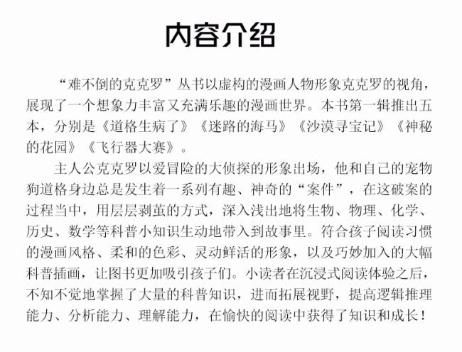 “难不倒的克克罗”丛书以虚构的漫画人物形象克克罗的视角,展现了一个想象力丰富又充满乐趣的漫画世界。本书第一辑推出五本,分别是《道格生病了》《迷路的海马》《沙漠寻宝记》《神秘的花园》《飞行器大赛》。