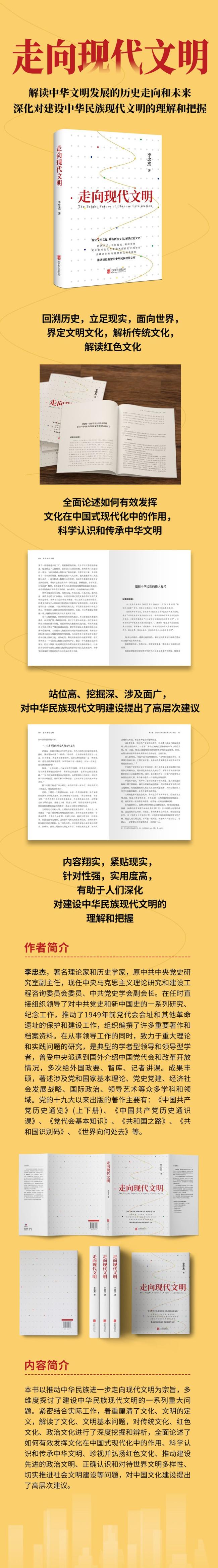 本书以推动中华民族进一步走向现代文明为宗旨,多维度探讨了建设中华民族现代文明的一系列重大问题。紧密结合实际工作,着重厘清了文化、文明的定义,解读了文化、文明基本问题,对传统文化、红色文化、政治文化进行了深度挖掘和辨析,全面论述了如何有效发挥文化在中国式现代化中的作用、科学认识和传承中华文明、珍视并弘扬红色文化、推动建设 的政治文明、正确认识和对待世界文明多样性、切实推进社会文明建设等问题,对中国文化建设提出了高层次建议。 本书站位高、挖掘深、涉及面广,内容翔实,紧贴现实,针对性强,实用度高。每篇文稿前都精心撰写了“纪事和说明”,介绍文章背景与脉络,提示新颖而关键的观点,帮助人们 好地结合历史与现实,深化对中华民族现代文明的理解和把握。