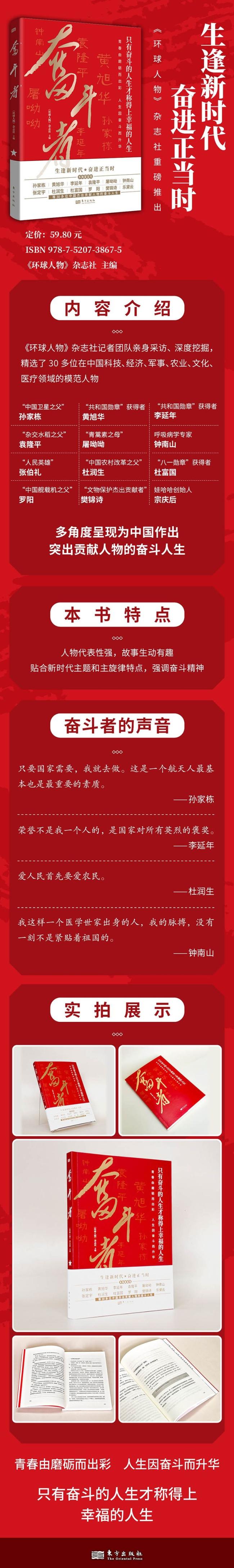本书聚焦30多位在中国科技、经济、军事、农业、文化、医疗领域中不懈奋斗并作出突出贡献的人物。将这些人物的奋斗故事、在各自领域所作的贡献,以及成就背后所蕴含的奋斗精神清晰地呈现出来,用他们的 事迹和感人故事激励全党全国各族人民坚守爱国情怀、坚定奋斗意志,激发各行各业的人士 加努力奋斗,为实现中华民族伟大复兴 凝聚起强大的精神力量。