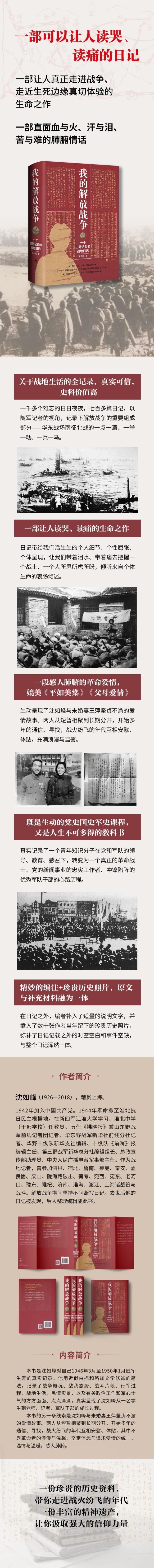 ★一部关于战地生活的全记录,真实可信,史料价值高 一千多个难忘的日日夜夜,七百多篇日记,以一个亲临现场的随军记者个性化、具体化、个别化的视角,记录下解放战争的重要组成部分——华东战场南征北战的一点一滴、一举一动、一兵一马,展示了解放战争的艰苦卓 ,反映了各种历史细节,把历史画面,把伟大斗争,把扭转乾坤的社会变革, 全面、 具体、 细腻、 贴切地展示出来,让人身临其境、感同身受。 ★一部让人读哭、读痛,让人真正走进战争、走近生死边缘真切体验的生命之作 日记从一个亲历者的视角给我们呈现伟大解放战争立体倒影的同时,也给了我们活生生的个人细节、个性屈张、个体呈现,让我们带着泪水、带着痛去把握一个战士、一个人所思所虑所盼,倾听来自个体生命的衷肠倾述,接受主人公心声心音的和盘托出; 给了我们不可多得的观察视角和人性揣摩——钢铁是这样炼成的、意志是这样铸造的、人格是这样升华的、党的好儿女是这样成长的。 ★一部直面血与火、汗与泪、苦与难的肺腑情话 本书的另一条线索是沈如峰与未婚妻王萍坚贞不渝的爱情故事,媲美《平如美棠》《父母爱情》。两人从短暂相聚到长期分开,开始多年的通信、寻找,战火纷飞的年代互相安慰、体贴,其中不乏革命者的浪漫与温馨、坚定信念与追求爱情的统一,温情与温暖,感人肺腑。 ★既是生动的党史国史军史课程,又是人生不可多得的教科书 日记记录了一个青年知识分子在党和军队的领导、教育、感召下,如何转变成为一个真正的革命战士、党的新闻事业的忠实工作者、冲锋陷阵的 军队干部的心路历程。全书既是对伟大的解放战争的另外诠释,又为中国社会的历史变革提供了 真确的细枝末节;既是生动的党史国史军史课程,又是人生不可多得的教科书。 ★精妙的编注+珍贵历史照片,原文与补充材料融为一体 在日记之外,编者补入了适量的说明文字,并插入了数十张作者当年留下的珍贵历史照片,弥补了日记记载之外的时空空白和事件空缺,这些内容与整个日记浑然一体,是本书编辑工作的一大特色。