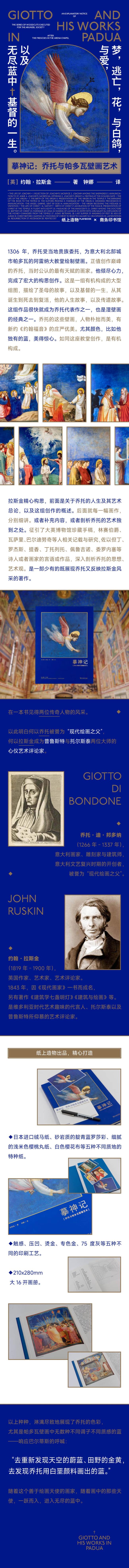 1306年,正值创作 的乔托移居意大利北部城市帕多瓦,创作了 的阿雷纳教堂 故事壁画。这组湿壁画共有38幅,主要描绘与圣母、 生平有关的《 》故事, 能代表他的艺术风格与成就。19世纪英国 艺术评论家拉斯金,逐一解读了这组湿壁画。 在总论中,他叙述了乔托的生平经历(尤其是负有盛名的“乔托的圆”)与艺术成就。接下来,他详细描绘每一幅壁画,深度解读其艺术独到之处。同时,大量引用大英博物馆珍藏手稿,林赛伯爵、瓦萨里、巴尔迪努奇等人相关记载与研究,以但丁、罗杰斯、提香、丁托列托、佩鲁吉诺、委罗内塞等哲人、诗人、画家为观照,深入剖析乔托的思想、艺术观。